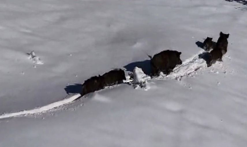 Drone kayıtlarında domuzların kalın kar üstünde birlikte hareket ettiği, zaman zaman durakladığı ve yön değiştirerek ilerlediği görülüyor. Sürü, bir süre sonra dağlık alana doğru yönelerek gözden kayboldu.