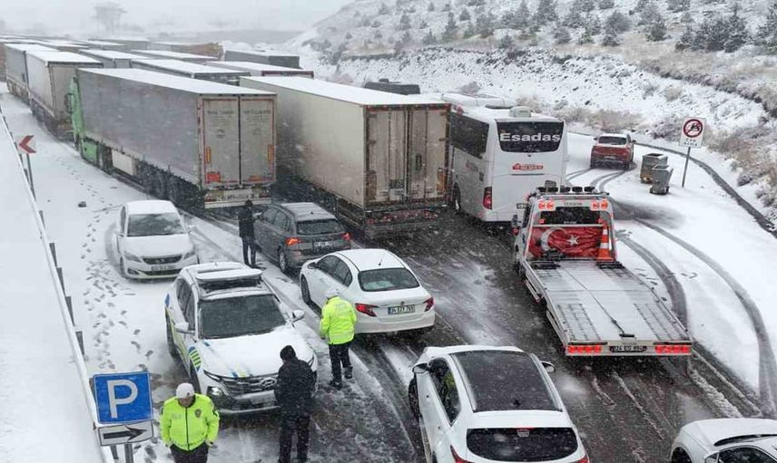 Polis ekipleri, durdurulan tır, çekici ile ağır tonajlı araç sürücülerini, kar ve buzlanma tehlikesi nedeniyle bir süre tesislerde dinlenmeleri konusunda uyarıyor.