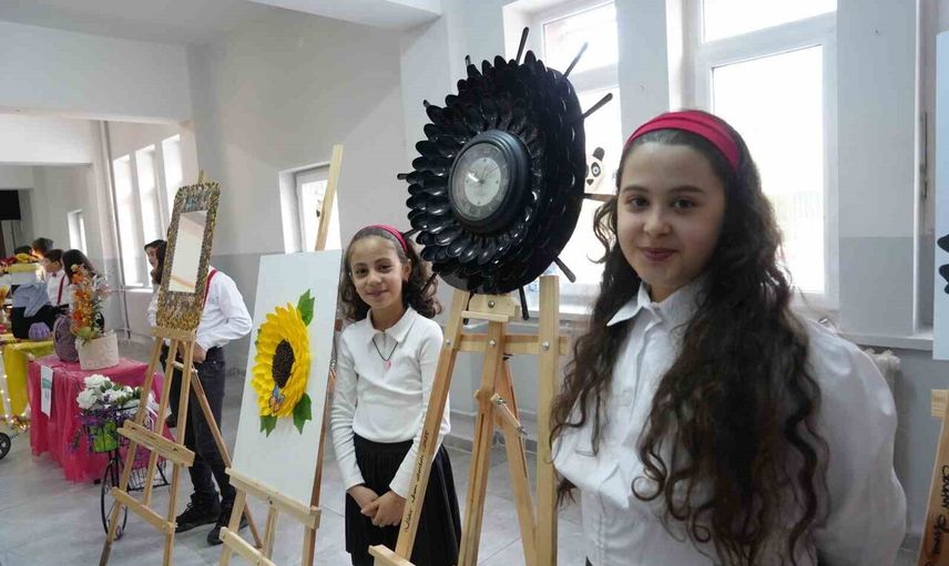 Erzurum'un Yakutiye ilçesindeki Kültür Kurumu İlkokulu 4'üncü sınıf öğrencileri, çevrelerinde kullanılmayan atıkları değerlendirerek birbirinden farklı eserler ortaya çıkardı. Çalışmalar, öğretmen ve velilerin desteğiyle hayat buldu ve okulun salonunda sergilendi.