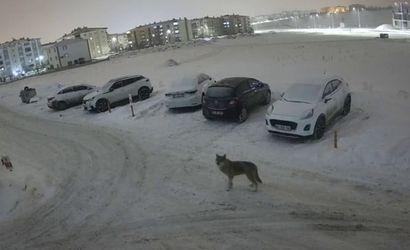 Kışın en çetin ve soğuk günlerinin yaşandığı bölgede doğada besin bulamayan yaban hayvanları kent merkezlerine yaklaşırken, kayıtlarda bir kurtun sitenin çöplüğünü karıştırdığı görülüyor. Sürekli çevresini kontrol eden kurt, yakında hareket eden bir otomobil nedeniyle panikleyip geldiği yöne doğru hızla uzaklaşıyor.