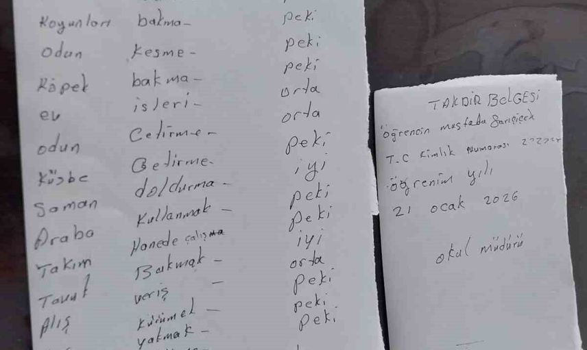 Eskişehir / Alpu Başören — 2025-2026 Eğitim Öğretim Yılı'nın ilk dönemi tamamlandı ve yurt genelinde başlayan 15 günlük tatil bugün başladı. Bu süreçte Başören Köyü'nde yaşayan 66 yaşındaki Mustafa Sarıçiçek, torunlarını teşvik etmek amacıyla ev yapımı bir karne ve takdirname düzenledi.
