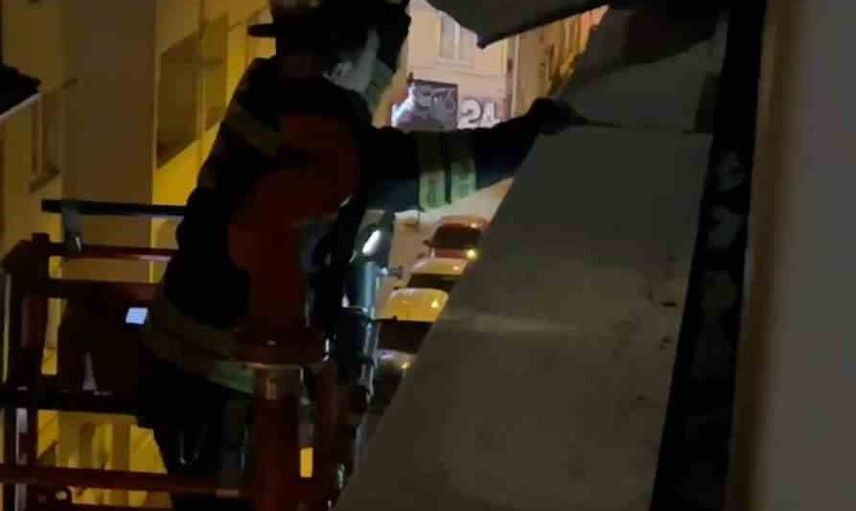 Durumun bildirilmesi üzerine bölgeye sevk edilen itfaiye ekipleri, karanlık ve kuvvetli rüzgâra rağmen dikkatli bir çalışma yürüttü. Ekipler, yüksekten sarkan ve her an düşme riski taşıyan metal parçayı kontrollü müdahale ile bulunduğu yerden çıkardı.