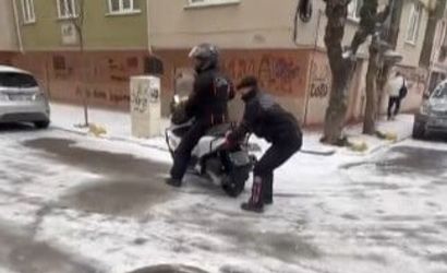 Kuryelerden biri motosikleti yavaş şekilde kullanırken, diğeri aracın arkasına tutunup buzlu zeminde kaydı. Görüntülerde, zeminin koşulları nedeniyle motosikletin zaman zaman ilerlemekte güçlük çektiği de görüldü.