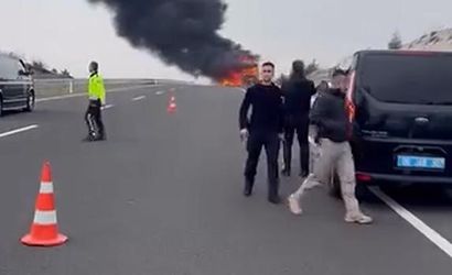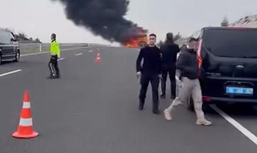 Ankara-İzmir seferini yapan ve içinde 25 yolcu, 2 şoför ile 1 muavin bulunan yolcu otobüsünün motor bölümünde henüz belirlenemeyen bir nedenle yangın çıktı. Alevler kısa sürede tüm aracı sardı ve otobüs kullanılamaz hale geldi.