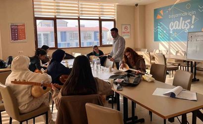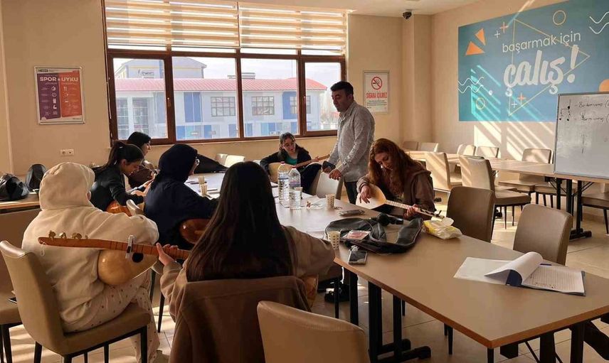 Eskişehir'de Hızır Bey Yurdu'nda kalan kız öğrenciler, düzenlenen bağlama kursunda bir araya geliyor. Kurs, Gençlik ve Spor Bakanlığı Kredi ve Yurtlar Genel Müdürlüğü (KYGM) bağlı yurtlarda yürütülen faaliyetler kapsamında gerçekleştiriliyor.