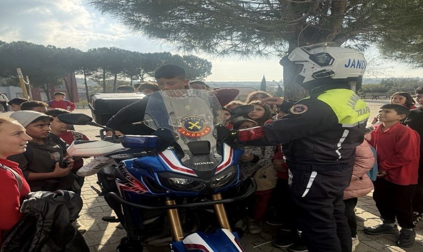 Çanakkale'nin Ezine ilçesine bağlı Geyikli beldesindeki İlköğretim Okulu'nda, 6'ıncı Moto Trafik Tim Komutanlığı ekipleri öğrenci ve öğretmenleri trafik konusunda bilgilendirdi.