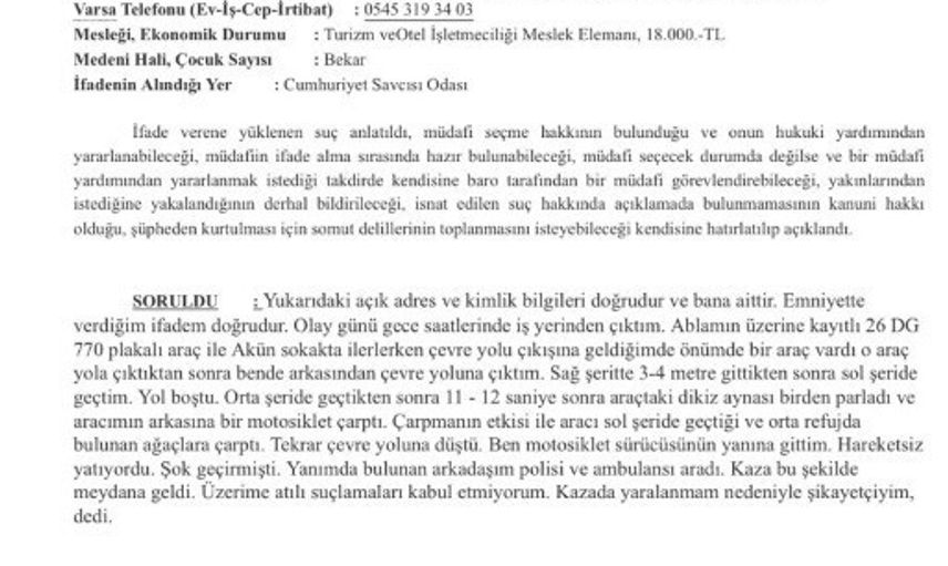 Eskişehir'de geçen yıl meydana gelen kazada, 35 BIP 389 plakalı motosikletiyle çevreyolunda ilerleyen 23 yaşındaki Yusuf Çakır, tali yoldan ana yola giren ve iddiasına göre en sol şeride geçen 26 DG 770 plakalı otomobile arkadan çarptı. Çarpmanın ardından ağır yaralanan Çakır, günlerce Yunus Emre Devlet Hastanesinde yoğun bakımda tedavi gördü.