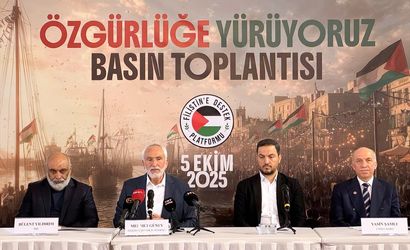 Filistin'in özgürlüğü ve Küresel Sumud Filosu'na destek için bir araya gelen Filistin'e Destek Platformu, "Özgürlüğe Yürüyoruz" çağrısıyla, 5 Ekim Pazar günü yürüyüş yapacak. İnsan ve Medeniyet Hareketi Genel Merkezi'nde gerçekleştirilen basın toplantısında, Filistin'e Destek Platformu çatısı altında bir araya gelen STK temsilcileri, 5 Ekim Pazar günü Ayasofya Camii'nden Eminönü Meydanı'na yapacakları yürüyüşe katılım çağrısında bulundu. Filistin'e Destek Platformu Dönem Başkanı Mehmet Güney (sol 2), toplantıda konuşma yaptı.