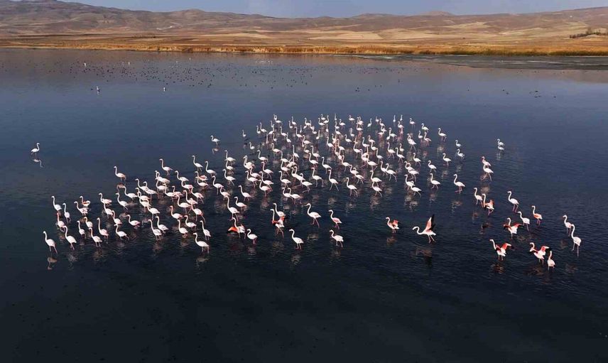 Pembe tüyleri, uzun boyunları ve estetik duruşlarıyla doğa tutkunlarının ilgisini çeken flamingolar, bölgede hava sıcaklıklarının mevsim normallerinin üzerinde seyretmesi nedeniyle konaklama sürelerini uzattı. Başta Urumiye Gölü olmak üzere bazı göllerin kuruması sonrası flamingolar, Van Gölü kıyıları ve Erçek Gölü'nde toplanarak bölge ekosistemine canlılık katıyor. Suya düşen nazlı gölgeleri ve sakin danslarıyla flamingolar, dron görüntüleriyle de kayda alındı.