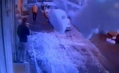 GAZİANTEP'TE BİR İŞ YERİNİN ÖNÜNDE BEKLEYEN ÇALIŞAN, ÇATIDA BİRİKEN KAR KÜTLESİNİN DÜŞMEK ÜZERE OLDUĞUNU FARK ETTİ. TAM BU SIRADA YOLDAN GEÇEN VATANDAŞ ÇALIŞANIN UYARISI SAYESİNDE KAR KÜTLESİNİN ALTINDA KALMAKTAN SON ANDA KURTULDU.
