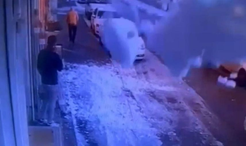 Gaziantep'te bir iş yerinin önünde bekleyen çalışan, çatıda biriken büyük bir kar kütlesinin düşmek üzere olduğunu fark etti. Yoldan geçen bir vatandaşı uyararak olası bir facianın önüne geçti.