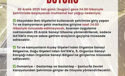 Öte yandan, Osmaniye-Gaziantep ve Gaziantep-Şanlıurfa Devlet Karayolu üzerinden kente yapılacak girişlerin otoyola yönlendirileceği belirtildi. Valilik, belirlenen güzergâhlar dışındaki tır ve kamyonların şehir merkezine kesinlikle alınmayacağını vurguladı.