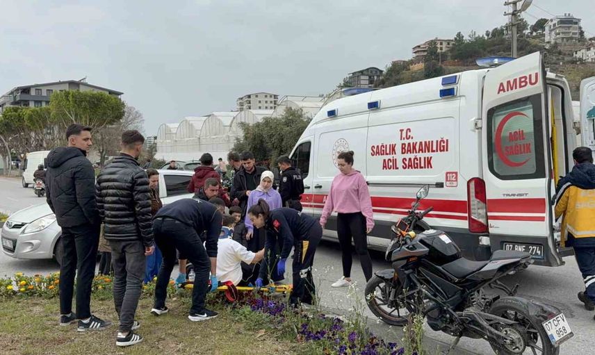 Edinilen bilgiye göre, Gümrük Sokaktan Uğur Mumcu Caddesi’ne çıkan Ali Y. idaresindeki 07 BEL 796 plakalı Hyundai marka otomobil ile çarşı yönünden deniz yönüne doğru seyir halindeki Arda Y. yönetimindeki 07 BTZ 772 plakalı motosiklet çarpıştı. Çarpışmanın etkisiyle motosiklet sürücüsü asfalt zemine savrularak yaralandı. Olay üzerine sağlık ve polis ekipleri sevk edildi.