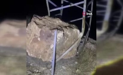 Gercüş’te yamaçtan kopan dev kaya elektrik direğine çarptı