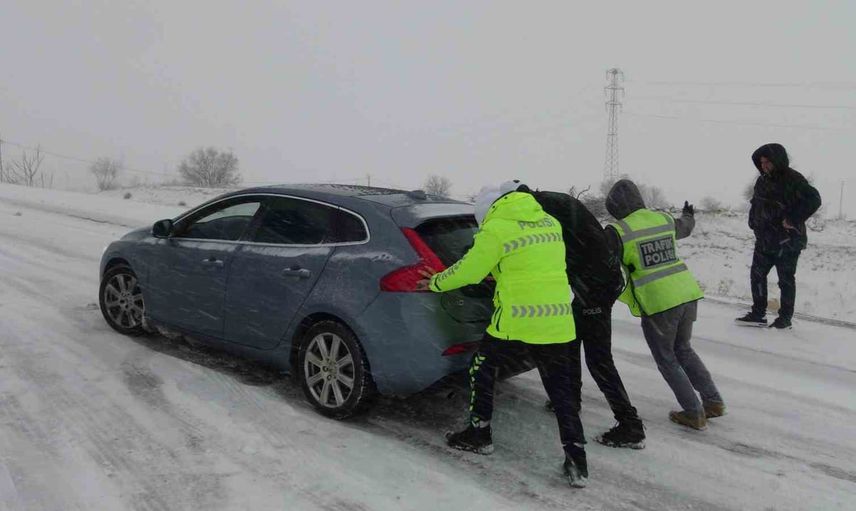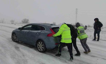 Patinaj yapan ve hareket edemeyen araçları soğuk hava şartlarına rağmen kurtaran polisler, müdahaleleriyle trafiğin yeniden açılmasını sağladı ve sürücülere rahat nefes aldırdı.