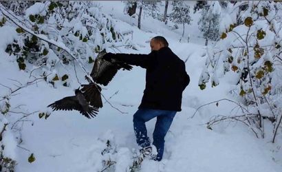 Giresun'un Dereli ilçesi Yavuzkemal beldesinde yoldan geçen vatandaşlar, yol kenarında karlar içinde bir atmacanın pençelerinde çırpınan karganın çığlığını duyunca araçlarından inerek müdahale etti.