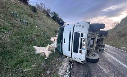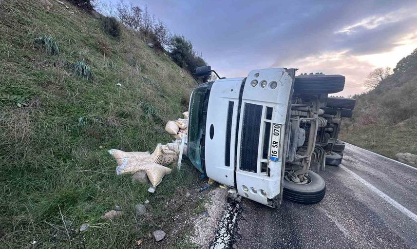 Gönen-Denizkent yolunda yem yüklü kamyon devrildi