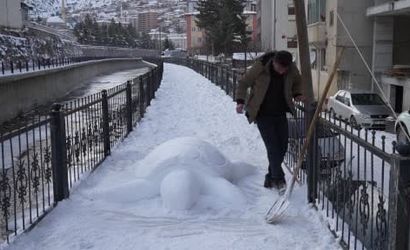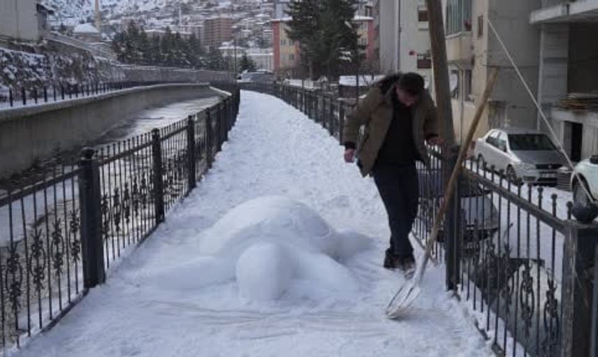 Gümüşhane sokaklarında tır şoförü Cihan Oral ile kızı Hilal Oral tarafından yapılan kardan kaplumbağa heykeli dikkat çekti.