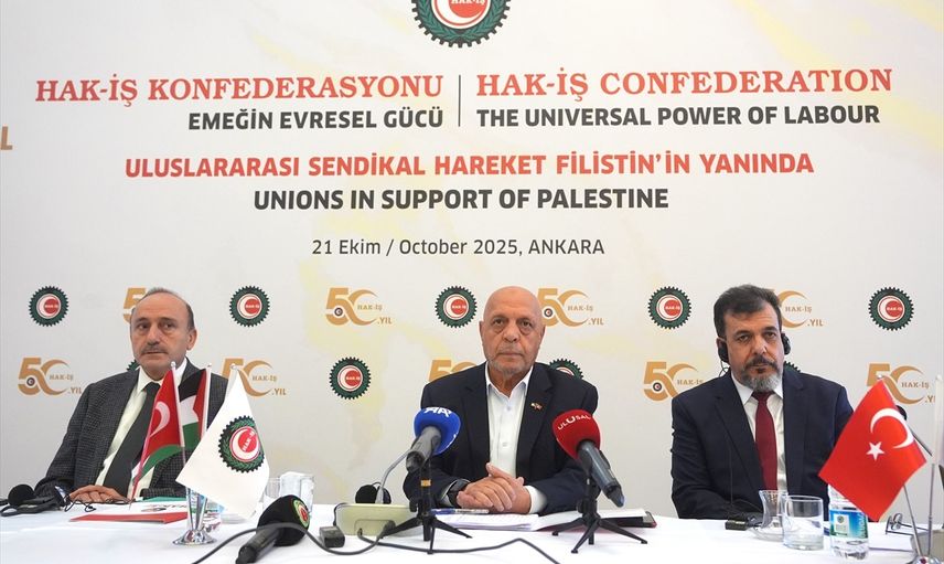 HAK-İŞ'in 50. kuruluş yıl dönümü etkinlikleri kapsamında, başkentte "Uluslararası Sendikal Hareket Filistin'in Yanında" temasıyla program düzenlendi. Filistin halkının mücadelesine destek amacıyla düzenlenen programa, HAK-İŞ Genel Başkanı Mahmut Arslan'ın (sağda) yanı sıra 22 ülkeden 45 uluslararası sendika temsilcisi katıldı.
