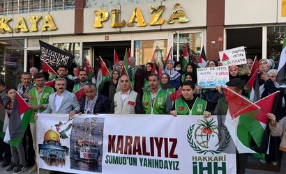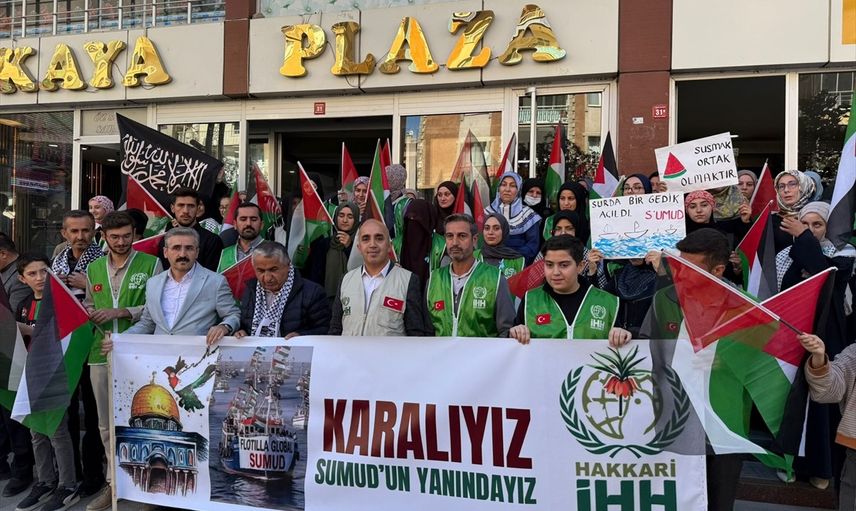 Hakkari'de İnsan Hak ve Hürriyetleri (İHH) İnsani Yardım Vakfı Hakkari Şube Başkanlığı öncülüğünde Bulvar Caddesi'nde bir araya gelen katılımcılar, İsrail'in Gazze'ye ve Küresel Sumud Filosu'na düzenlediği saldırıları protesto etti.