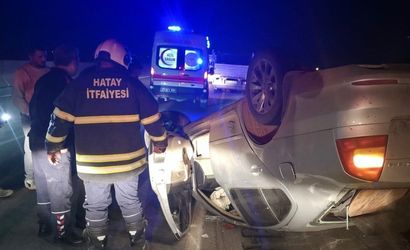 Hatay’ın Hassa ilçesi Girne Mahallesi mevkiinde, Hatay - Gaziantep yolu üzerinde seyreden bir otomobil, aynı istikamette giden başka bir araca çarpması sonucu sürücünün kontrolünü kaybetmesiyle takla atarak ters döndü.