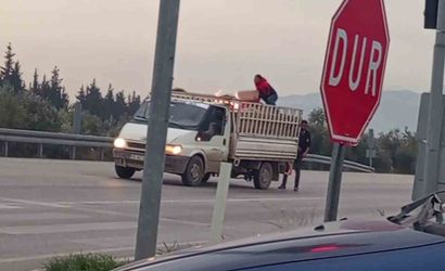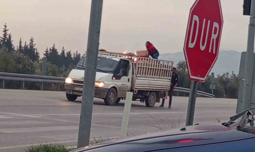 HATAY'DA SEYİR HALİNDEYKEN KASA KISMINDAKİ EŞYALARIN YANDIĞINI FARK EDEN KAMYONET SÜRÜCÜSÜNÜN YANAN EŞYALARI BOŞALTTIĞI ANLAR KAMERAYA YANSIDI.