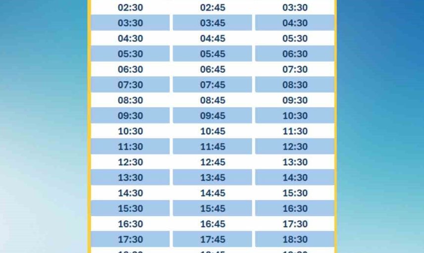 Kalkış (Fuar Alanı): 00.30, 01.30, 02.30, 03.30, 04.30, 05.30, 06.30, 07.30, 08.30, 09.30, 10.30, 11.30, 12.30, 13.30, 14.30, 15.30, 16.30, 17.30, 18.30, 19.30, 20.30, 21.30, 22.30, 23.30