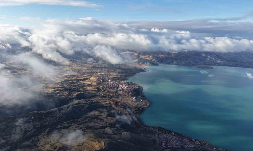 Elazığ’da karla kaplı Hazarbaba Dağı ile eteğindeki Hazar Gölü, bulutlar ve sisle birlikte adeta kartpostallık görüntüler oluşturdu.