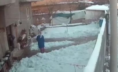 Şanlıurfa'nın Hilvan ilçesinde 2 gün önce başlayan ve kısa sürede etkisini artıran kar yağışının ardından bir evin önündeki buzlanma, ev sakinlerinin kapıdan çıktığı sırada yaşanan anları güvenlik kamerasına yansıttı.