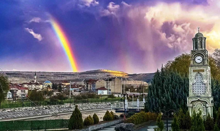 Kütahya'nın Hisarcık ilçesinde yağmurun ardından beliren gökkuşağı, Gençlik Parkı'ndeki Saat Kulesi üzerinde oluşarak sıra dışı bir görsel şölen sundu.