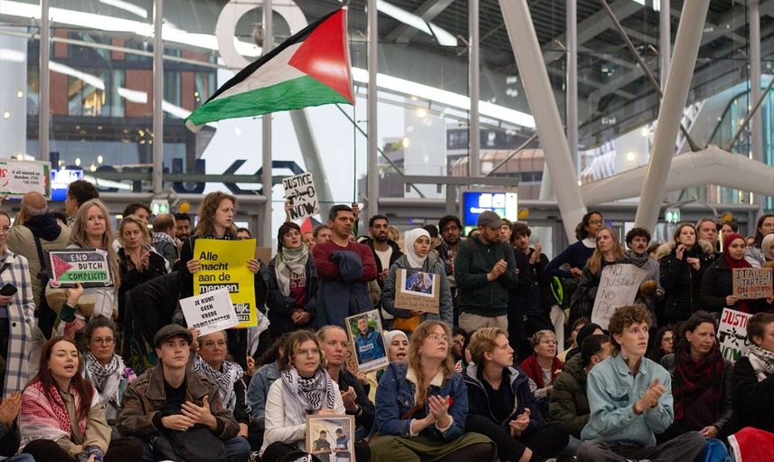 Hollanda'da Utrecht, Amsterdam ve Rotterdam başta olmak üzere farklı kentlerdeki toplam 20 tren istasyonunda, Filistin'e destek için oturma eylemi düzenlendi. Merkez niteliğindeki Utrecht’te tren istasyonunda toplanan göstericiler, Filistin bayrakları taşıyarak İsrail’in soykırımı durdurması için eylem yaptı.