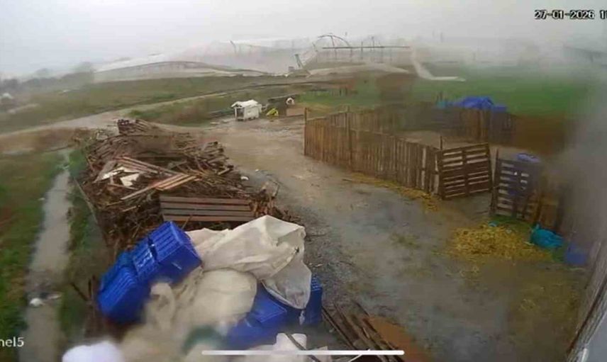 Kayıtlarda hortumun seraya ulaştığı, naylonların koparak savrulduğu ve yağış anındaki şiddetin hızla yıkıma dönüştüğü görülüyor. Görüntülerde hortumun serayı vurması ve parçalanan naylonların çevreye dağıldığı anlar net şekilde kaydedildi.