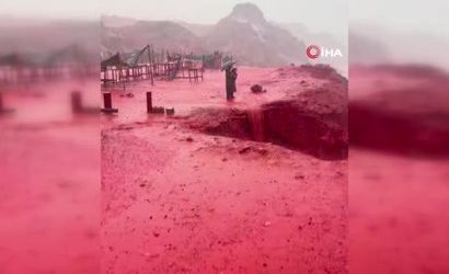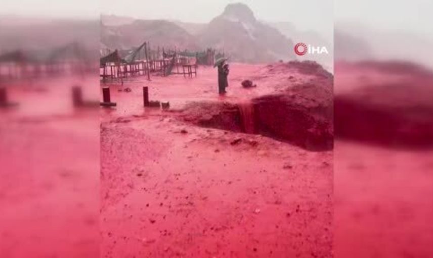 İran’ın güneyindeki Hürmüzgan eyaletinde yer alan ve Hürmüz Adası ile özdeşleşen Kızıl Sahil, sabah saatlerinde etkili olan yağışların ardından yeniden gündeme geldi. Yağmurla birlikte yüzeyden eriyen ve demir oksit bakımından zengin olan kırmızı toprak, dalgaların kıyıya vurmasıyla deniz suyuna karıştı ve sahil şeridi ile deniz yüzeyi geçici olarak kızıl bir görünüm kazandı.