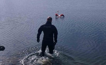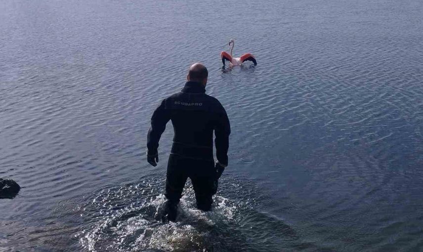 İzmir'in Balçova ilçesindeki İnciraltı Kent Ormanı sahilinde vücuduna ip dolanan bir flamingo, müdahaleye giden ekiplerce kurtarıldı. Olay yerine sevk edilen İzmir Büyükşehir Belediyesi İtfaiye Dairesi Başkanlığına bağlı İzmir İtfaiyesi Su Altı ve Su Üstü Arama Kurtarma Birimi dalgıçları, kuşu kurtarmak için harekete geçti.