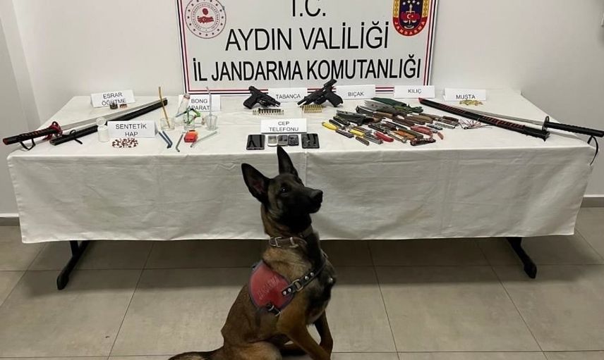Aramada 51 adet sentetik hap, 2 adet bong aparatı, 2 adet tabanca, 59 fişek, 3 şarjör, 25 adet sustalı bıçak, 2 adet samuray kılıcı, 1 muşta ve 5 cep telefonu ile Jandarma Komando Timi ve narkotik ile bomba arama köpeklerinin katıldığı arama ekipmanları ele geçirildi.