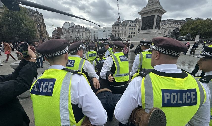 İngiltere’nin başkenti Londra’da Trafalgar Meydanı’nda toplanan göstericiler, Filistin eylemleriyle bilinen “Palestine Action”ı yasaklamasına tepki gösterdi. ‘Defend Our Juries’ adlı grubun çağrısıyla düzenlenen eyleme binlerce kişi katılırken, polis meydan çevresinde yoğun güvenlik önlemleri aldı. Gösterilerde çok sayıda kişi gözaltına alındı.