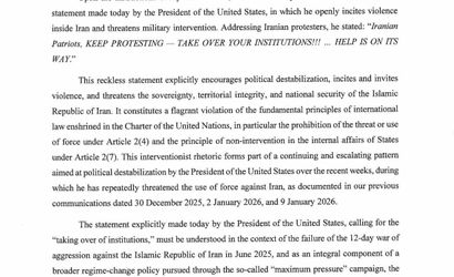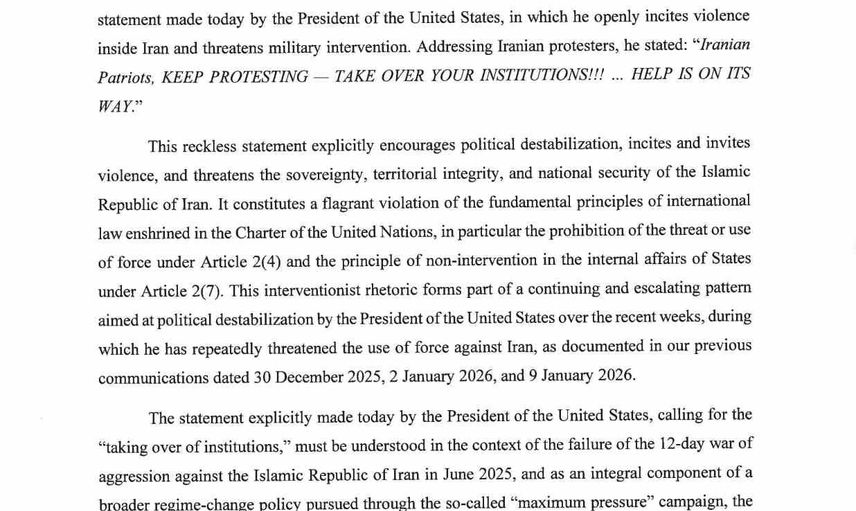 İravani, Trump’ın müdahaleci ve kışkırtıcı söylemlerinin, son haftalarda dile getirilen güç kullanma tehditlerinin bir parçası olduğunu ifade etti. Mektupta, Trump’ın "kurumların ele geçirilmesi" çağrısının Haziran 2025’te İran İslam Cumhuriyeti’ne karşı yürütülen ve başarısızlıkla sonuçlanan 12 günlük saldırı savaşı bağlamında değerlendirilmesi gerektiği belirtildi. Bu çağrının, söz konusu "azami baskı" kampanyasıyla sürdürülen daha geniş bir rejim değişikliği politikasının ayrılmaz bir unsuru olduğu iddia edildi.