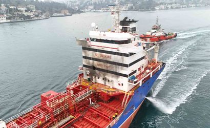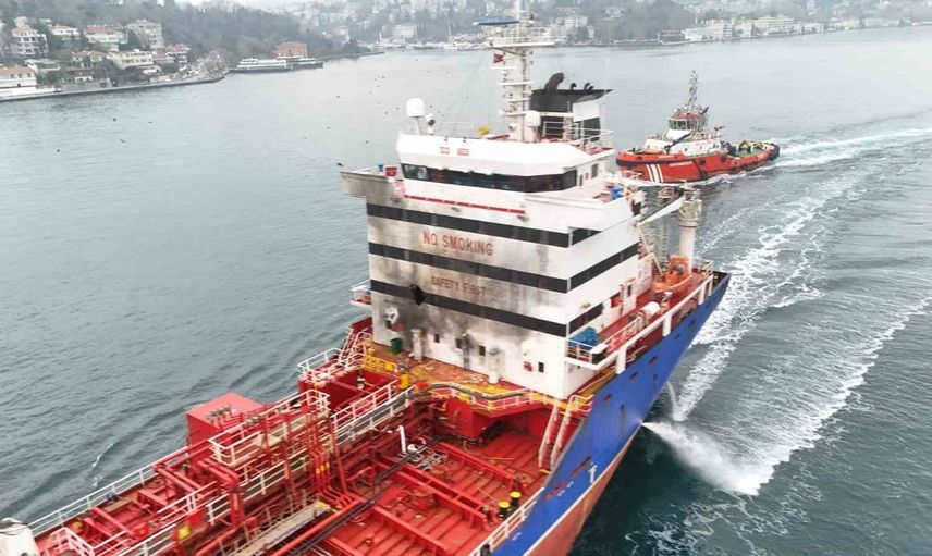 Odessa açıklarında 12 Ocak'ta Rusya kaynaklı insansız hava aracı saldırısında hedef alınan Panama bandıralı Ocean Tankers'e ait "Ata Voyager" tankeri, İstanbul Boğazı'ndan geçişi sırasında havadan kaydedildi.
