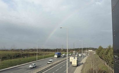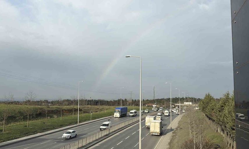 İstanbul'da sabah saatlerinde etkili olan kısa süreli yağışın ardından gökyüzünde beliren gökkuşağı, trafikte bulunan sürücülere adeta bir görsel şölen sundu.