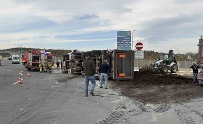 İSTANBUL HAVALİMANI YOLUNDA GÜBRE YÜKLÜ BİR HAFRİYAT KAMYONU, BAĞLANTI KAVŞAĞINA GİRDİĞİ SIRADA KONTROLDEN ÇIKARAK YAN YATTI. KAZADA KAMYON ŞOFÖRÜ YARALANIRKEN, TONLARCA GÜBRE YOLA DÖKÜLDÜ.