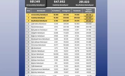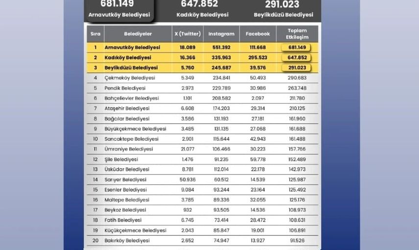 Yapılan analiz sonucunda Arnavutköy Belediyesi en yüksek etkileşime ulaşarak listenin zirvesine yerleşti. Arnavutköy Belediyesi, toplam 681 bin 149 etkileşimle ilk sırada yer aldı. İkinci sırayı Kadıköy Belediyesi 647 bin 852 etkileşimle alırken, üçüncü sırada Beylikdüzü Belediyesi 291 bin 23 etkileşimle yer aldı. Bu veriler sosyal medya yönetimi ve dijital içerik stratejilerinin kurumlar arasındaki farkını ortaya koyuyor.