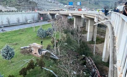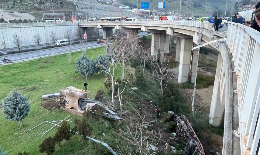 İzmir'in Buca bölgesinde akşam saatlerinde meydana gelen kazada, iş makinesi yüklü bir kamyonun frenlerinin boşalması sonucu önündeki otomobile çarpması sonucu üç kişi yaralandı. Çarpmanın etkisiyle otomobil köprü kenarında asılı kalırken, kamyon kasasındaki iş makinesi köprüden aşağı düştü.