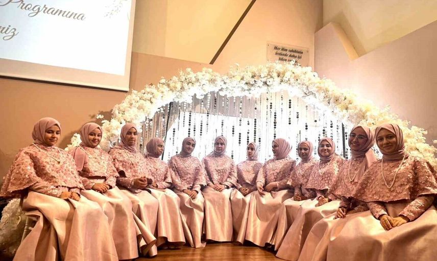 Hafızlıklarını tamamlayan 12 kız öğrenciye taçları giydirildi; daha sonra hafızlık belgeleri ve hediyeleri takdim edildi.