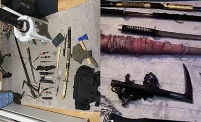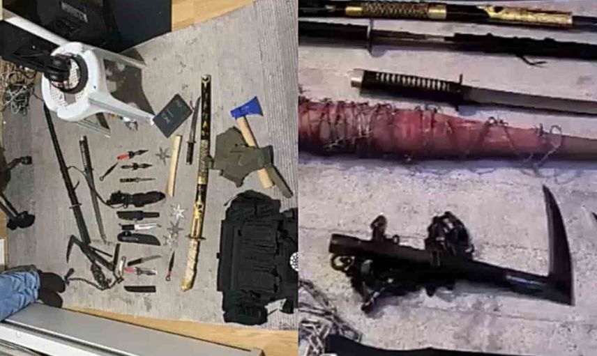 1 döner bıçağı, 1 hançer, 4 adet yıldız şeklinde kesici alet, 10 adet muhtelif özelliklerde bıçak, 2 adet balta, 3 adet orak, 6 adet fırlatma bıçağı, 3 adet katana/kılıç, 1 adet çelik tel sargılı sopa, 187 adet tabanca fişeği.