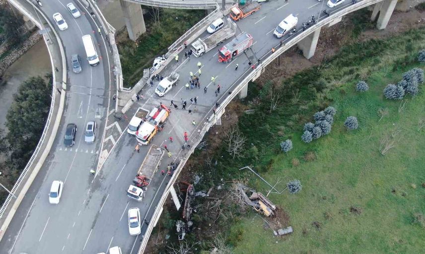 İddiaya göre seyir halindeki çekicinin freni boşaldı ve kontrolü kaybeden araç, önünde ilerleyen otomobile çarptı. Çarpışmanın etkisiyle savrulan otomobil bariyerleri aşarak viyadükte asılı kalırken, çekici metrelerce yükseklikten düştü.