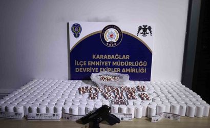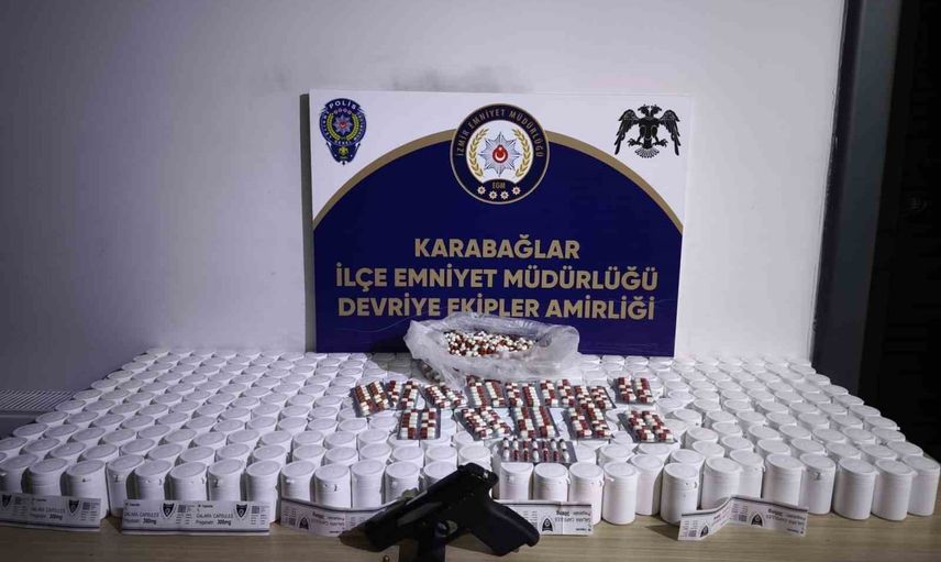 İZMİR’İN KARABAĞLAR İLÇESİNDE POLİS EKİPLERİ TARAFINDAN BİR ADRESE DÜZENLENEN OPERASYONDA, 17 BİN 460 ADET UYUŞTURUCU HAP İLE RUHSATSIZ TABANCA ELE GEÇİRİLDİ. OLAYLA İLGİLİ 1 ŞÜPHELİ GÖZALTINA ALINDI.