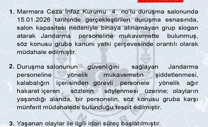 Jandarma Genel Komutanlığı, sosyal medya hesabından yaptığı paylaşımda, Marmara Ceza İnfaz Kurumu 4 no’lu duruşma salonunda 15 Ocak Perşembe günü gerçekleştirilen duruşma sırasında yaşananları duyurdu.