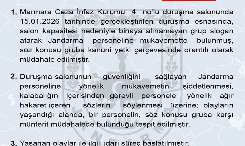 JANDARMA GENEL KOMUTANLIĞI’NIN SOSYAL MEDYA HESABINDAN YAPILAN PAYLAŞIMDA, "MARMARA CEZA İNFAZ KURUMU 4 NO’LU DURUŞMA SALONUNDA GERÇEKLEŞTİRİLEN DURUŞMA ESNASINDA, SALON KAPASİTESİ NEDENİYLE BİNAYA ALINAMAYAN GRUP SLOGAN ATARAK JANDARMA PERSONELİNE MUKAVEMETTE BULUNMUŞ, SÖZ KONUSU GRUBA KANUNİ YETKİ ÇERÇEVESİNDE ORANTILI OLARAK MÜDAHALE EDİLMİŞTİR" DENİLDİ.