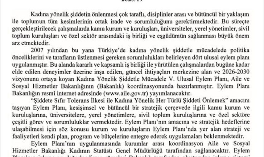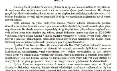 Aile ve Sosyal Hizmetler Bakanı Mahinur Özdemir Göktaş, sosyal medya hesabından yaptığı paylaşımda, "2026-2030 dönemini kapsayan ‘Kadına Yönelik Şiddetle Mücadele 5’inci Ulusal Eylem Planımız’, Resmi Gazete’de yayımlanarak yürürlüğe girdi." ifadelerine yer verdi.
