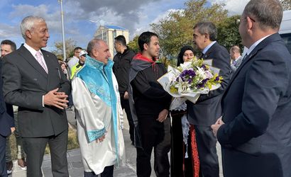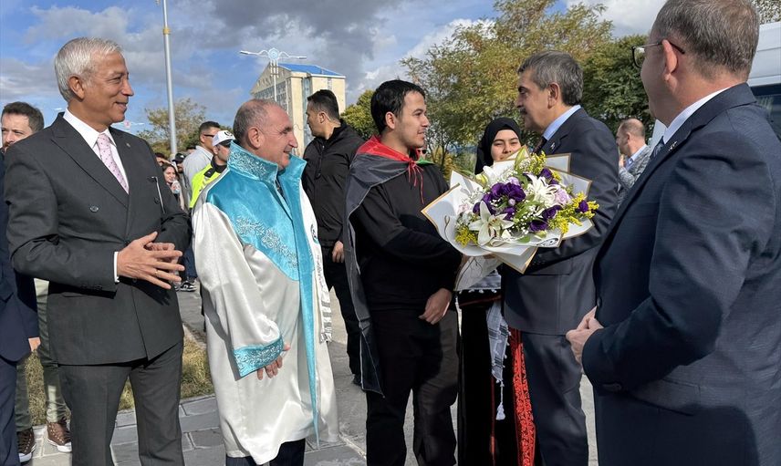 Kars Kafkas Üniversitesi 2025-2026 akademik yılı açılış törenine katılmak üzere Kars'a gelen Milli Eğitim Bakanı Yusuf Tekin'i Üniversite Kültür Merkezi girişinde Filistinli öğrenciler çiçeklerle karşıladı.